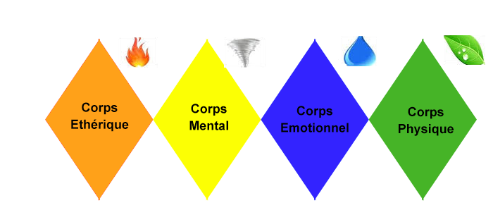 corps éthérique, corps mental, corps émotionnel, corps physique qui répondent aux quatre éléments : feu, air, eau, terre.
